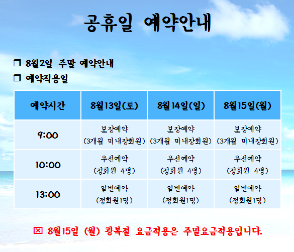 | 8¿ù 15ÀÏ ±¤º¹Àý ¿¹¾à ¾È³» | °ü¸®ÀÚ | |||